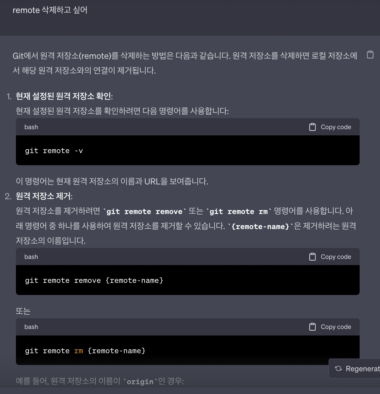 원격 저장소가 성공적으로 제거되었는지 확인--> 현재 원격 저장소 목록 확인