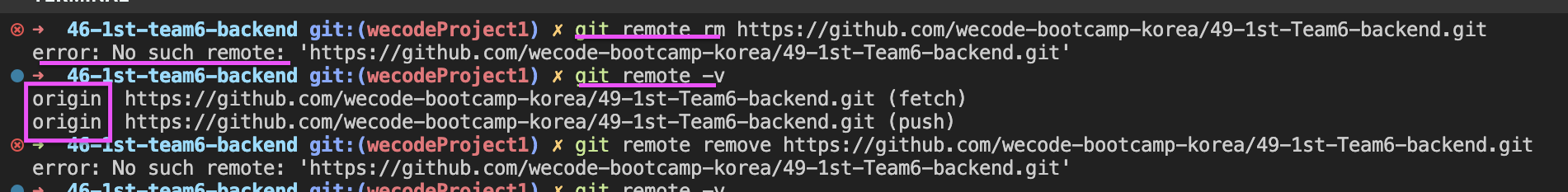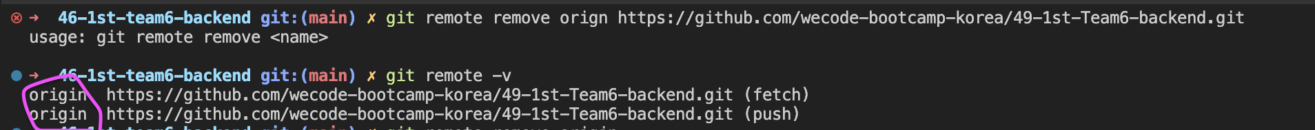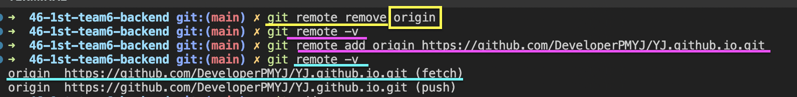 git remote remove를 할 때에는, origin 변수에 넣어뒀으니, 변수 제거를 해야 해서!