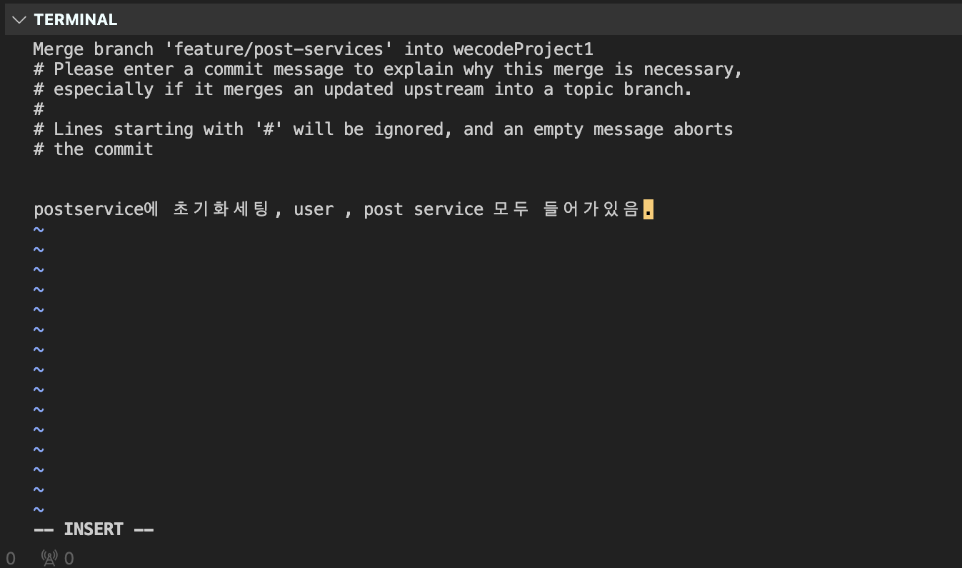commit을 남기기 위해, i를 눌러서 insert하고