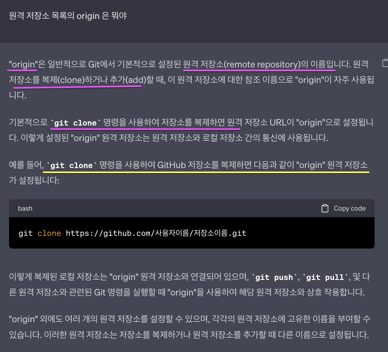 혹시 이 앞단의 있는 origin이 원격 저장소의 이름일까? 변수이다 (프로젝트 2, 5일차의 내가 대답)