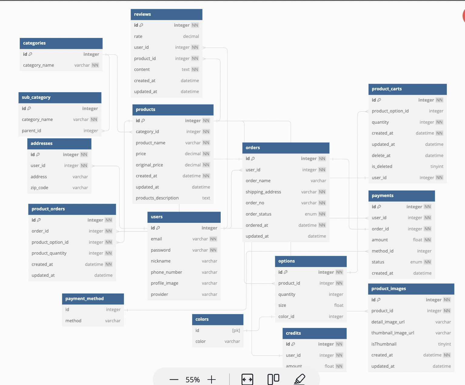 product_orders -> 유저(누가 샀는지), Ordernumber(주문번호), ordername(주문자와 받는자가 다를 때), orders에 product가 들어가는게 아니라, 사실상 Product_options가 들어가는 거,