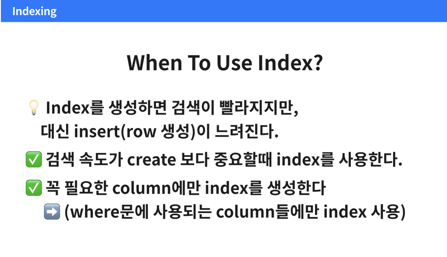꿀팁: sql where구★부터 짜고, 검색 속도가 느려졌다ㄴㄴ 판단에 index 만든다