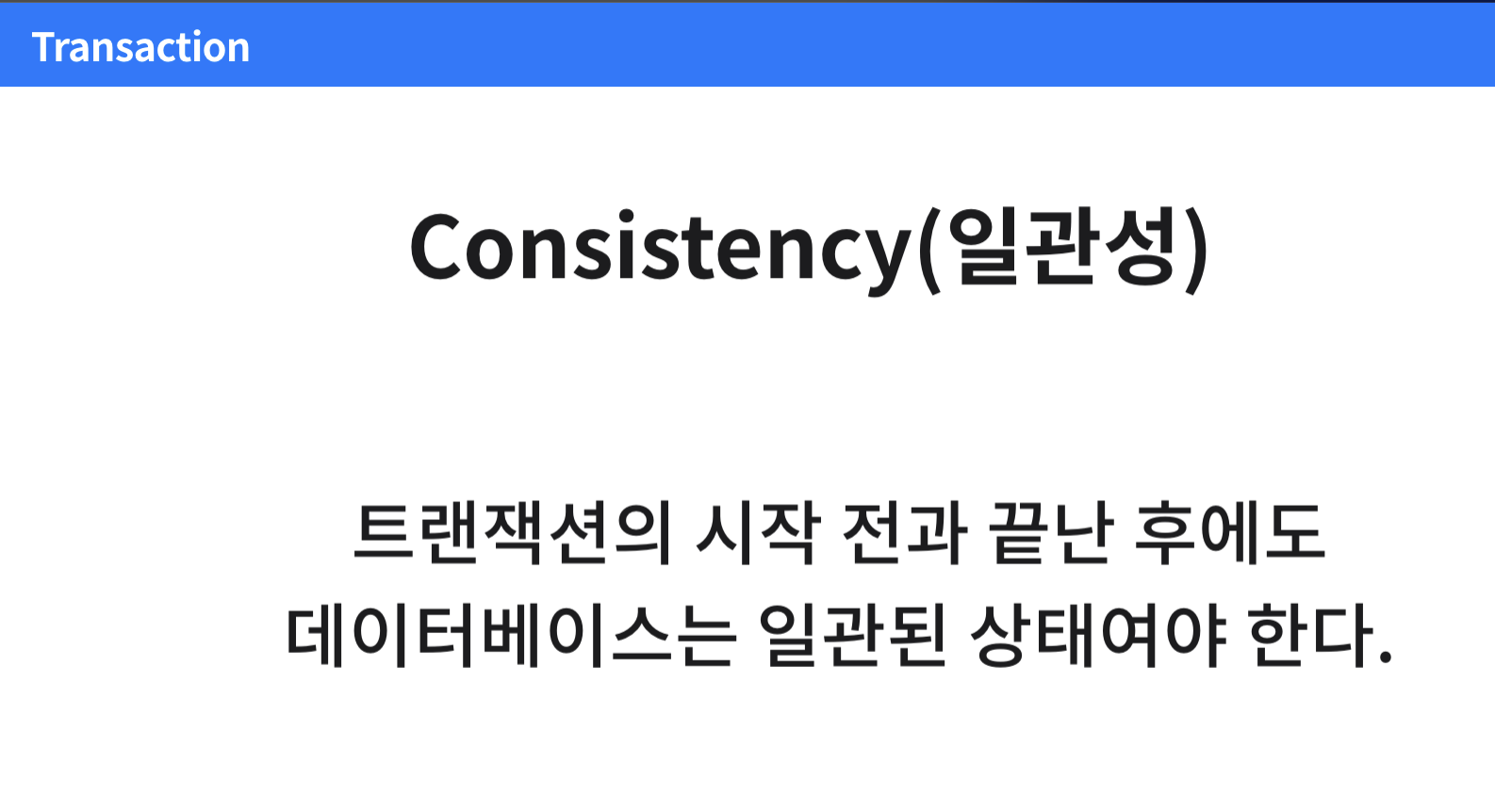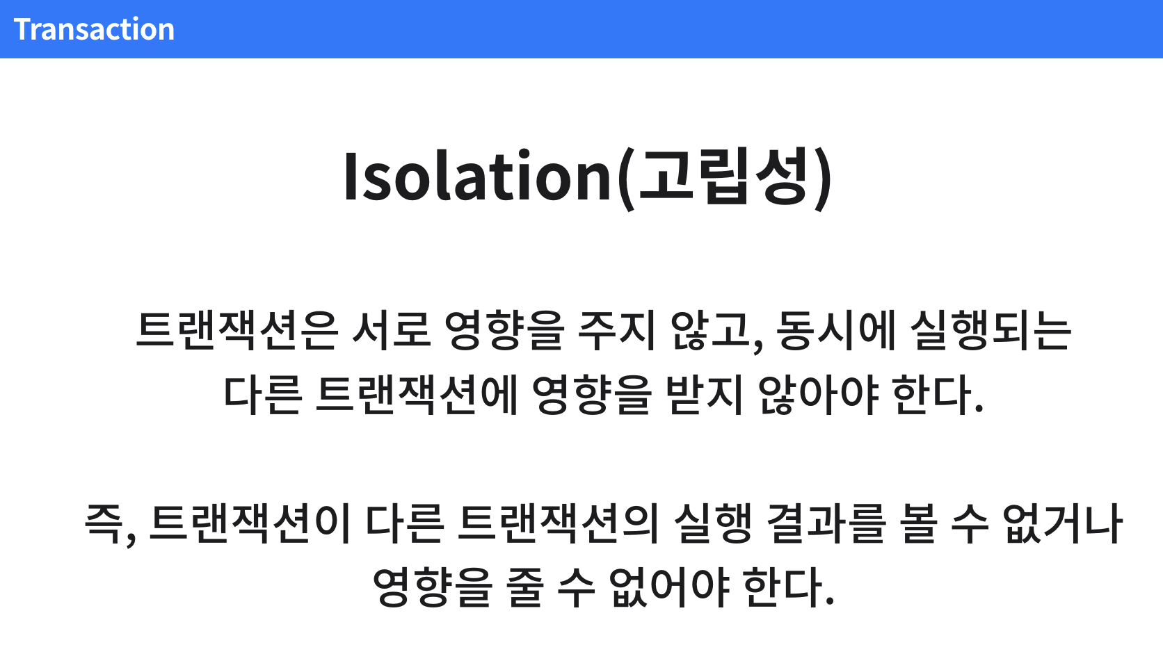 3. 고립성 - 모든 transaction은 서로 영향 주지 않음. (transacton A가 B에게 영향 주면 안됨