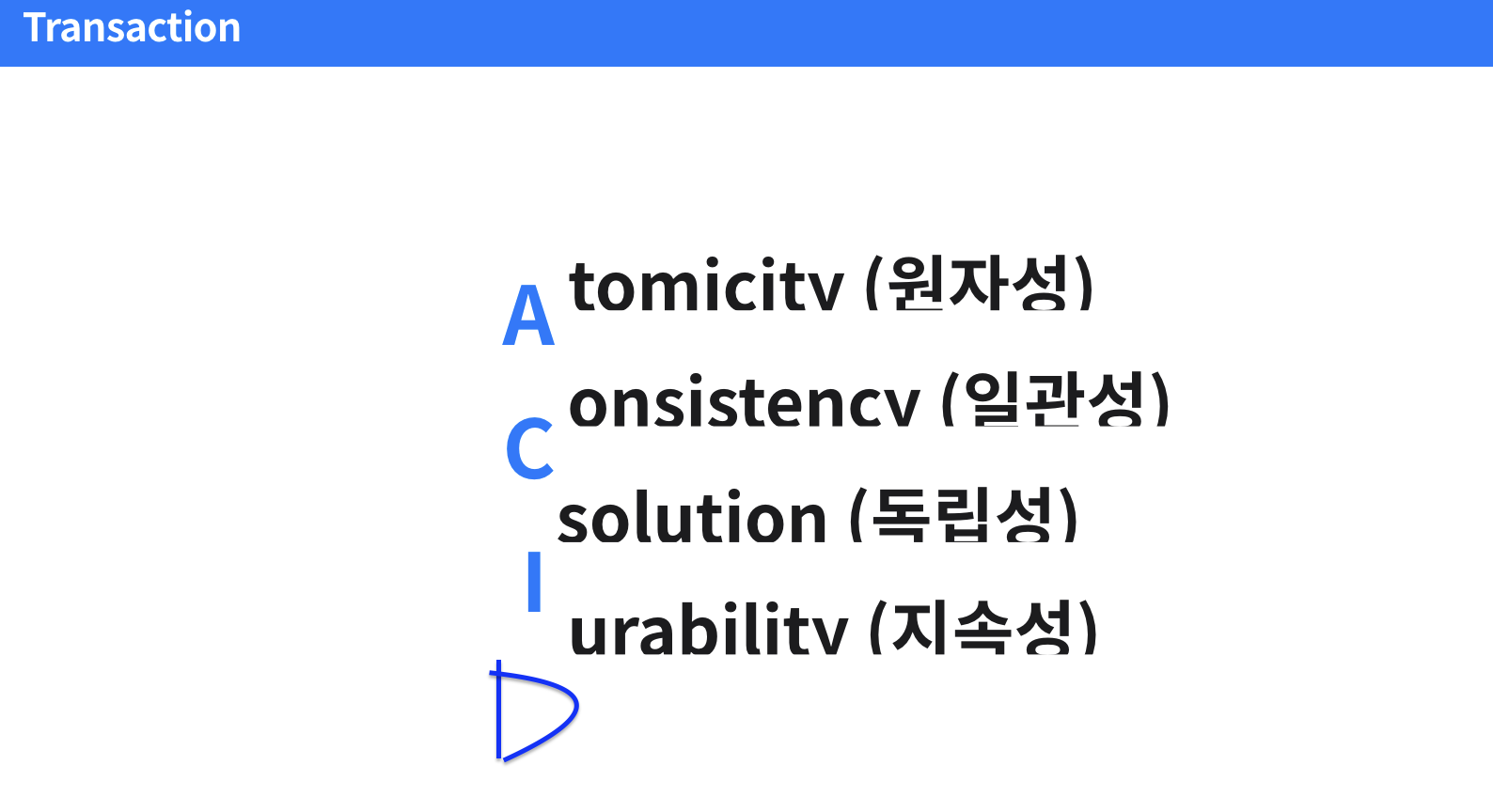3. 고립성 - 모든 transaction은 서로 영향 주지 않음. (transacton A가 B에게 영향 주면 안됨