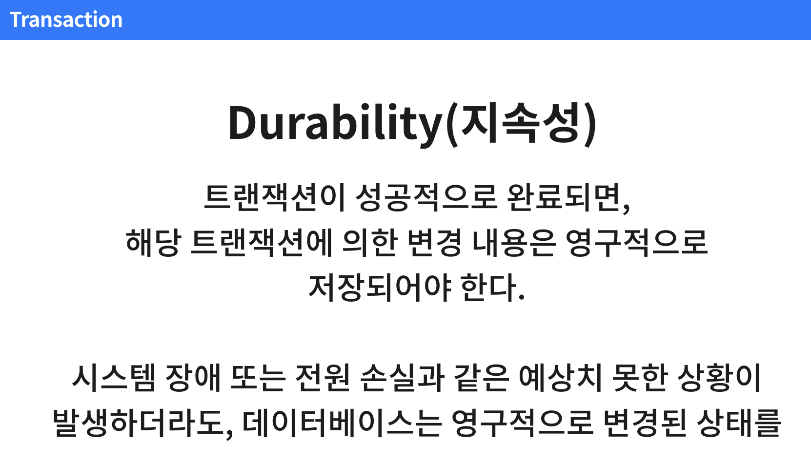 4. 지속성 - transaction 성공하면, commit내용은 저장된다. / 전원손실 돼도 변경 상태 유지