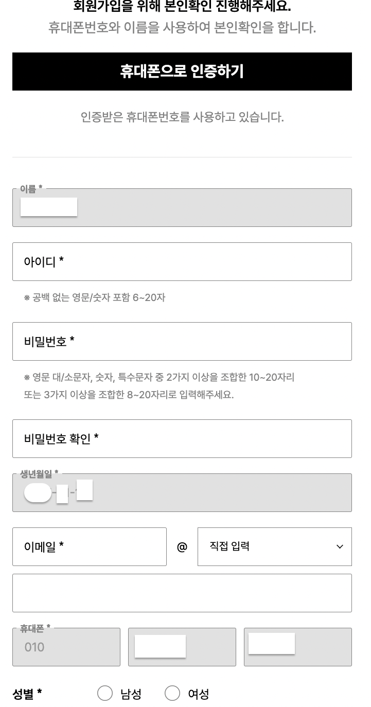 이름, 아이디, 비밀번호, 생년월일, 이메일, 휴대폰, 성별을 줬는지