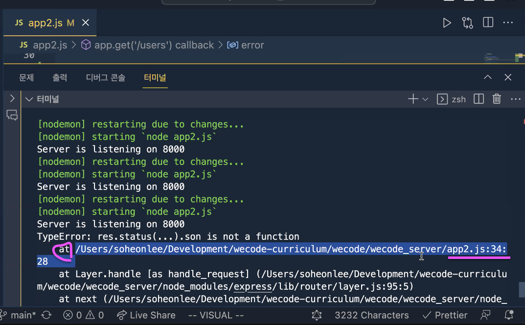 --> app2.js 파일의 34번 줄에 오류가 있다.