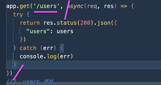 - app.get (인자1, 인자2): 함수 (첫번째 인자 '/users', 두번째 인자 끝까지)