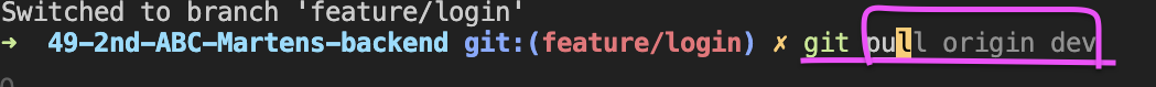 2-1. git checkout dev, git pull origin dev (dev로 가서 Pull 받은 뒤)
