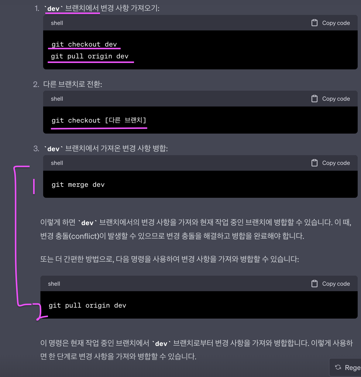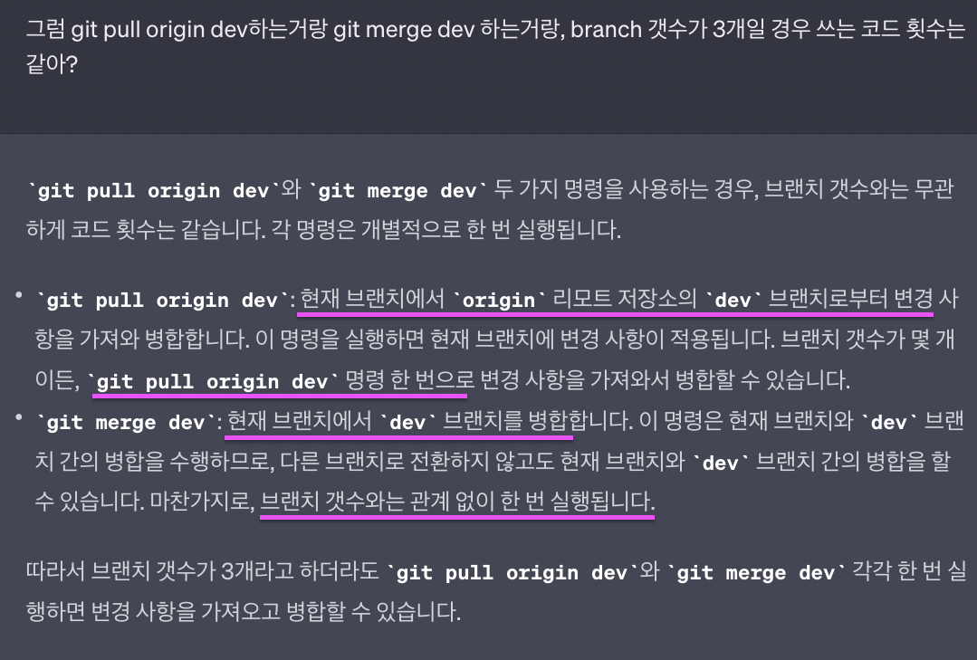 그러면, git merge dev 랑 git pull origin dev나