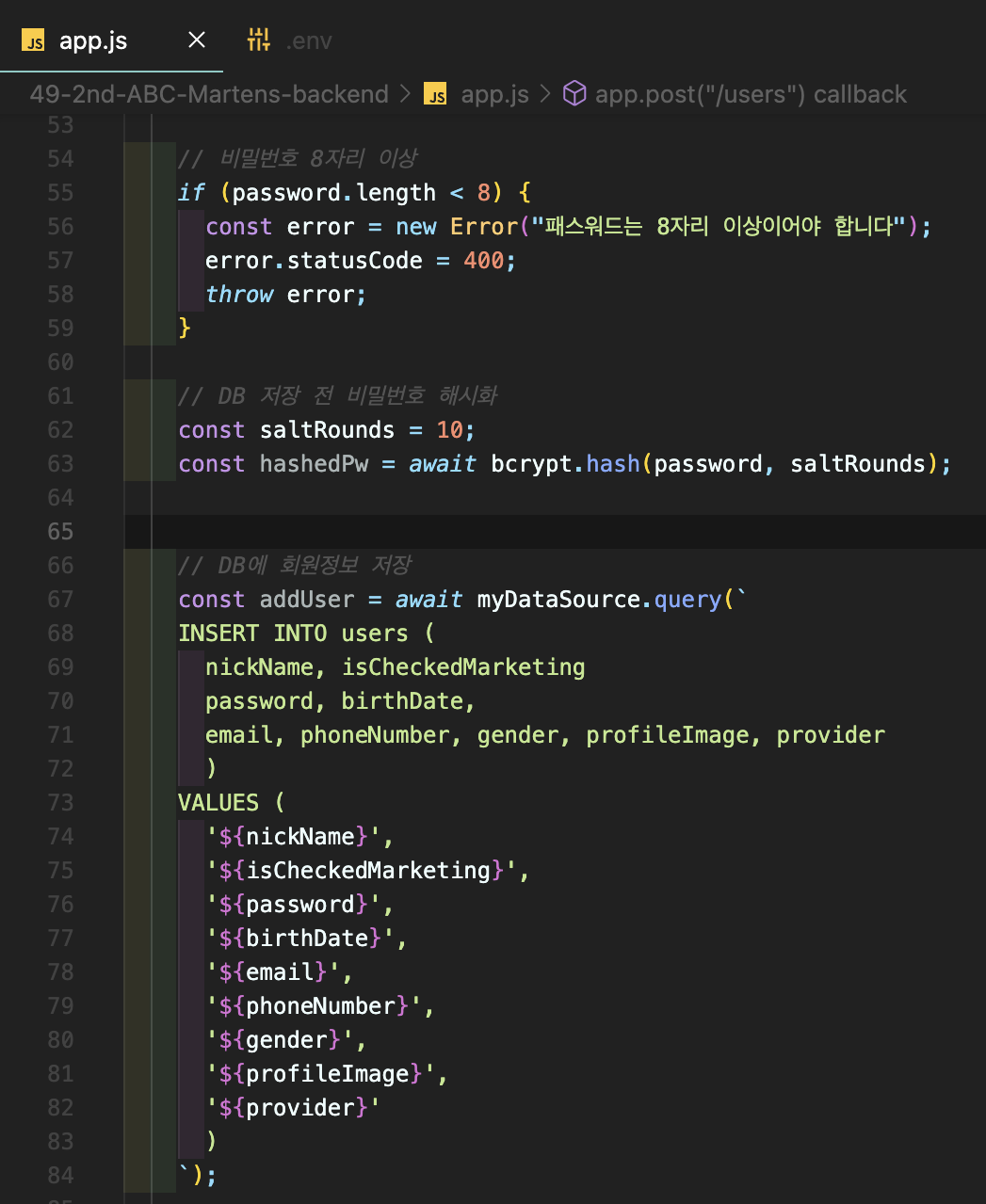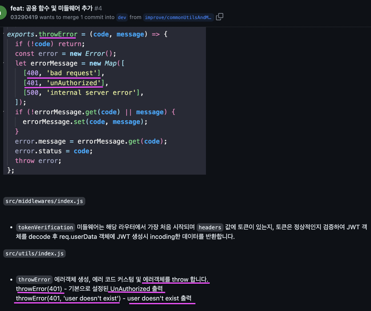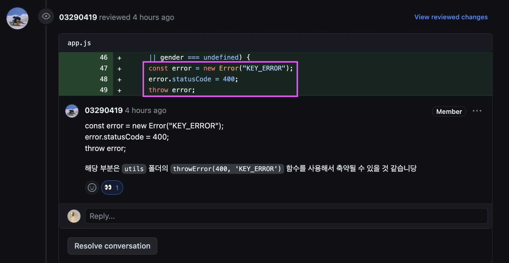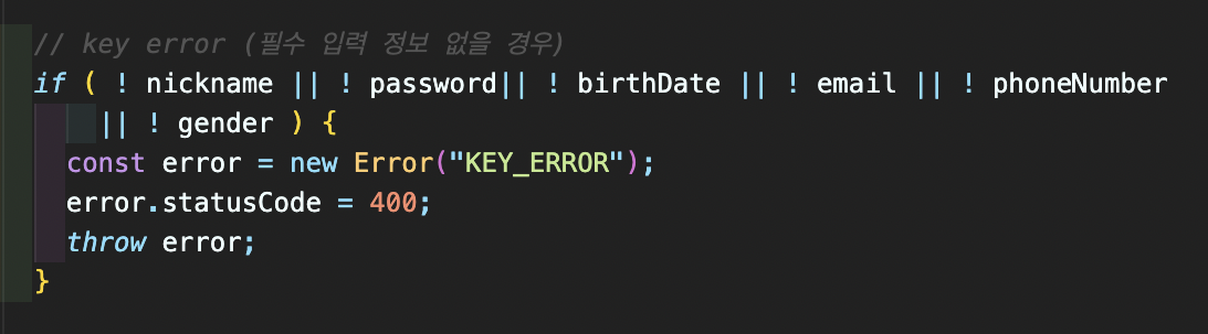 해당 부분은 utils 폴더의 throwError(400, 'KEY_ERROR') 함수를 사용해서 축약될 수 있을 것 같습니당]