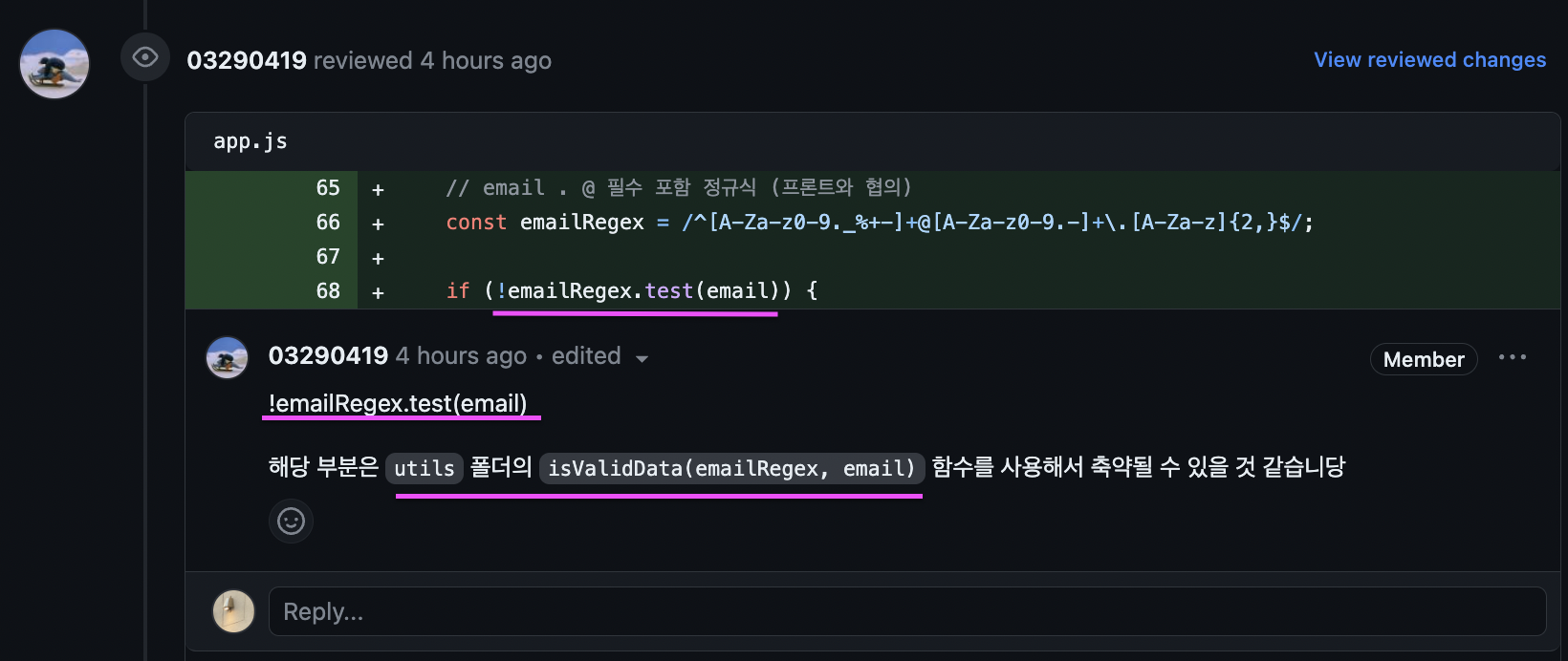 해당 부분은 utils 폴더의 isValidData(emailRegex, email) 함수를 사용해서 축약될 수 있을 것 같습니당]