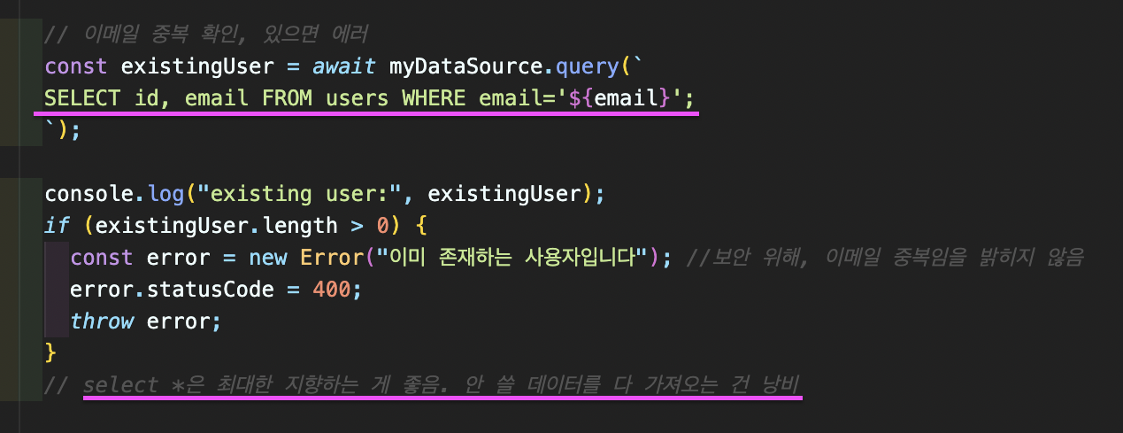 --> 최대한, * 은 안 쓰는 게 좋음. 쓰지 않을 데이터까지 다 가져오는 데이터 낭비가 되니까.