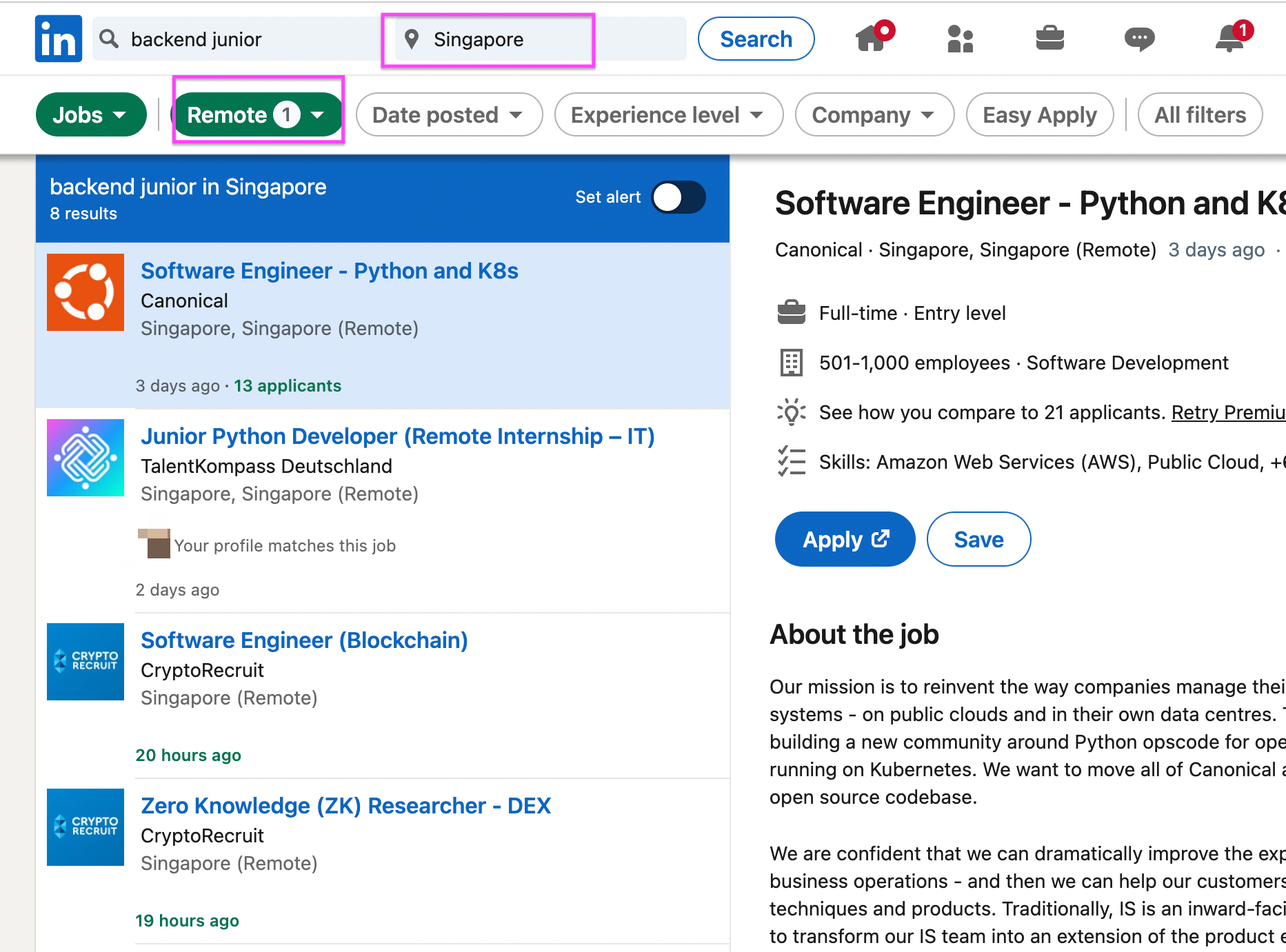 싱가폴 remote로 주니어 백엔드 개발자로 일할 수 있니?