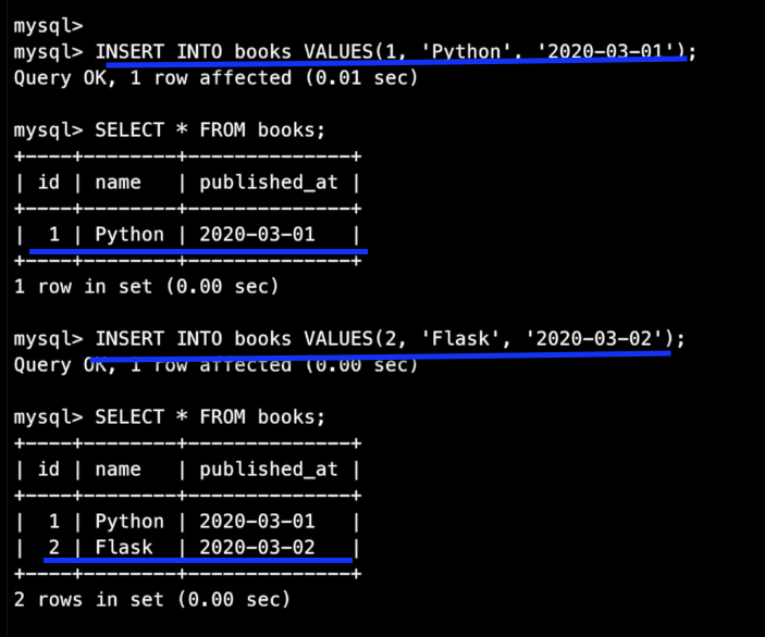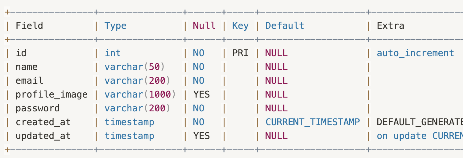 CREATE TABLE [tablename] ([column_name1] INT PRIMARY KEY AUTO_INCREMENT, --> INT: 데이터타입[column_name2] VARCHAR(255) NOT NULL, --> VARCHAR: 데이터타입[column_name3] DATETIME NOT NULL,)CHARSET=utf8;