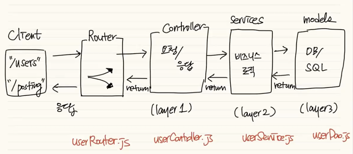 다음은 실제 Express를 이용한 서버 웹 개발시 Layered Pattern을 이루는 기본 구조입니다.