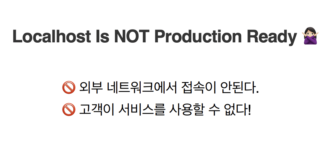 - 외부 네트워크에서 접속이 어려움: 팀원들이 접속하기 어려움 : 언제어디서나 사용하기가 어려움 ip → 같은 네트워크/ 와이파이로만 접속이 가능함 (집에 갓어-> 못 함) 미국이나 등등 에서는 접속 어려움