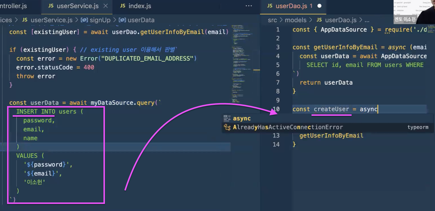 -> userService로 넘어감. userService에 있는 signup 함수가 실행이 되고, 쭉 내려가서 실행 되다가, userDao에 있는 getUserInfoByEmail함수를 호출하는 코드를 만들음.