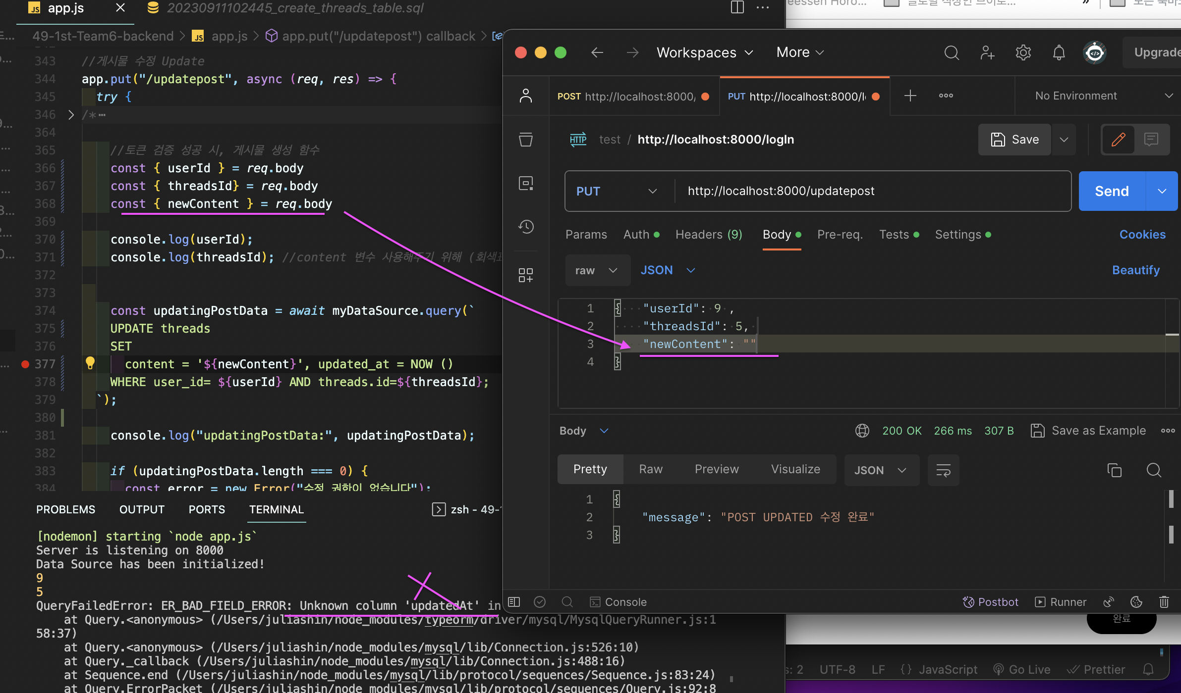 업데이트 될 칼럼은 content, updatedAt 니까 퀴리문을 아래와 같이 짰다.