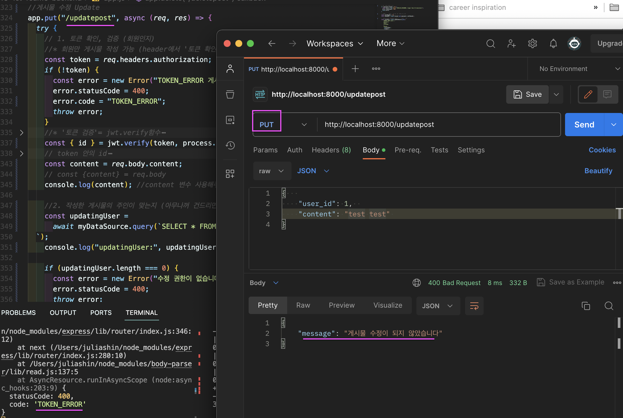 [postman] Api 주소 createPost, createpost 상관없는지 -> url은 소문자가 법칙 [postman header에 token 담기] Auth에 안 해도 되고 bearer 안해도 되고 Tests 안 해도 되고 environment - global 전역변수 안 해도 되고 Headers