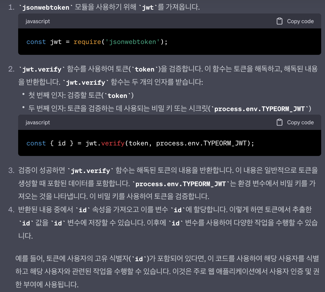 - 토큰 확인, 비밀번호 해쉬와 같은 코드들 내가 뇌에서 만들어내는게 아니라