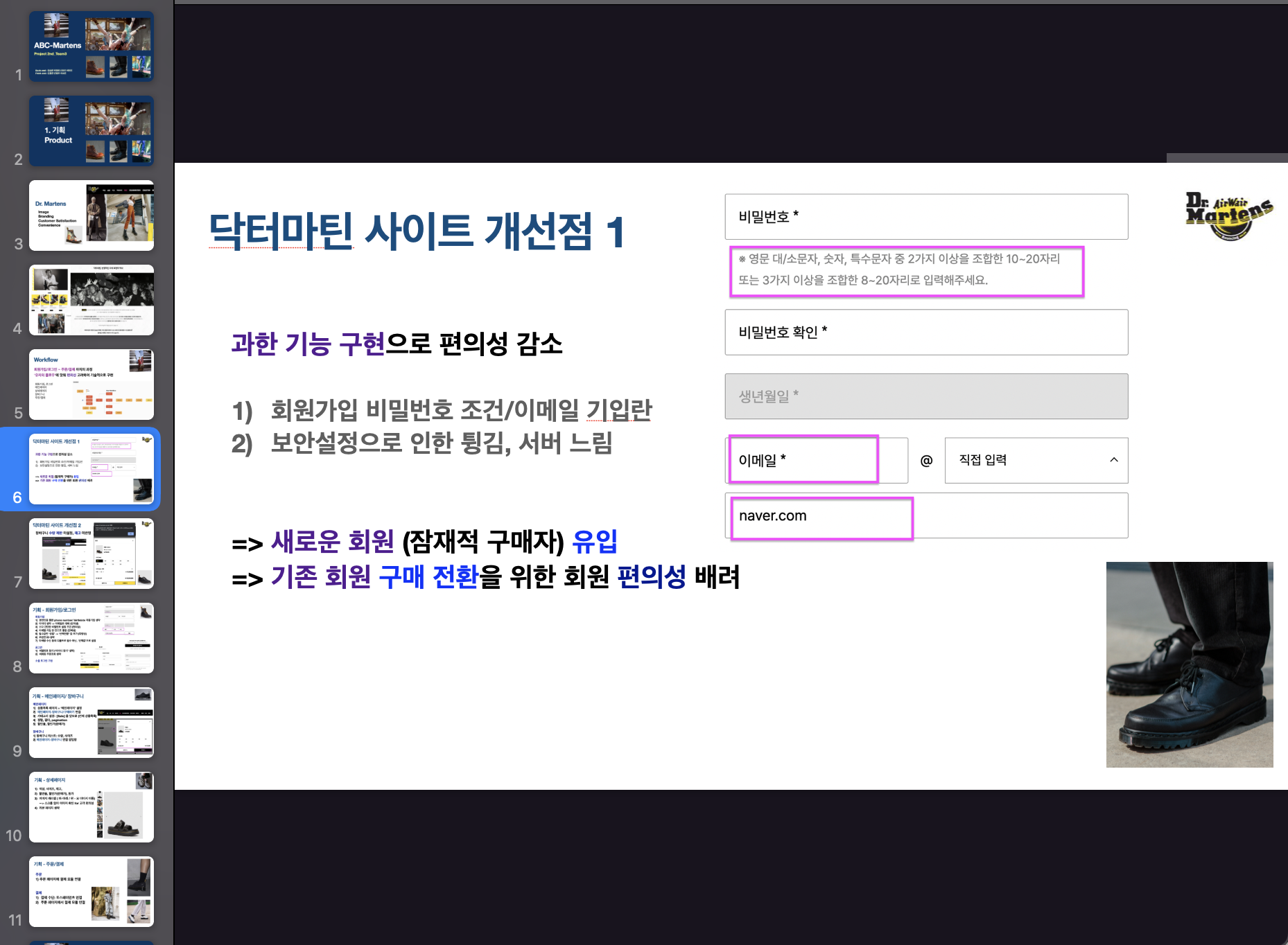 비밀번호 조건이 까다로워 회원가입을 직접 해볼 때 이탈 가능성이 있었다.