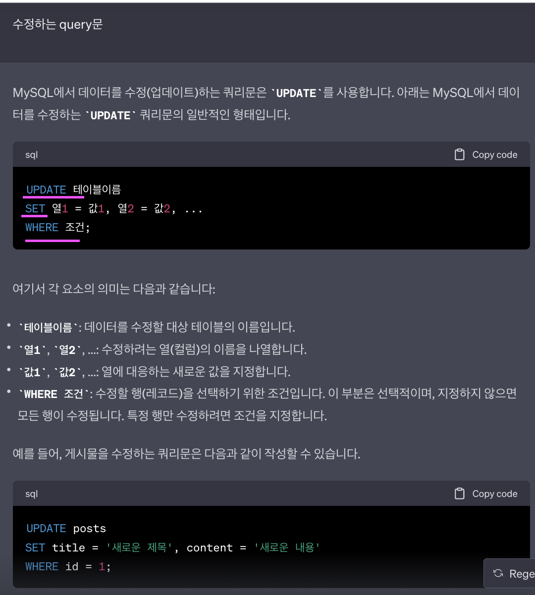select부터가 아니라 이 한줄이 쿼리문이고, 백팁을 써야 한다는 점 (맥북 기준 option + ~)