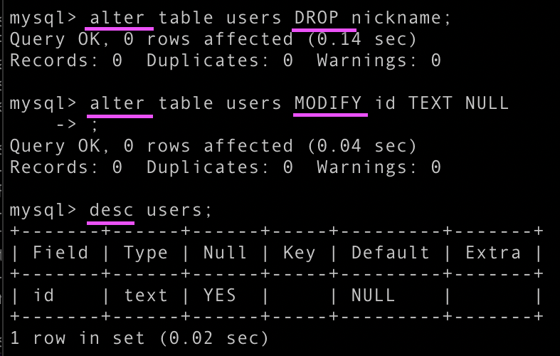 기존에 테이블 객체 내에 데이터(row)가 존재하는 경우, 자료형(Type) 변경에 따라 데이터의 자료형 역시도 변환됩니다. 다만 처리과정에서 에러가 발생하면 ALTER TABLE 명령이 적용되지 않을 수 있습니다. 지금 예제에서는 테이블의 자료형 변경에 대한 내용만 다루었지만, MODIFY가 아닌 CHANGE 명령을 통해서 열 이름도 변경할 수 있습니다. 자세한 내용은 MySQL 공식문서를 참고해주시기를 바랍니다.