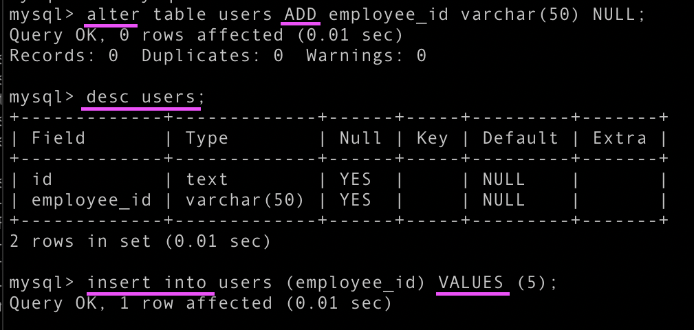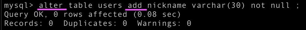 add column 을 매번 쳐줘야 하고, varchar 뒤에 (길이 제한) 써줘야 함, INT 뒤에는 길이 제한 없음