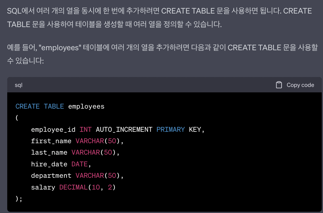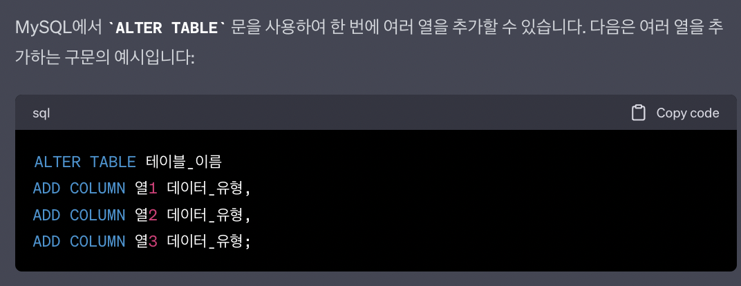 1) 이미 만들어진 테이블에서 동시에 여러 열 추가