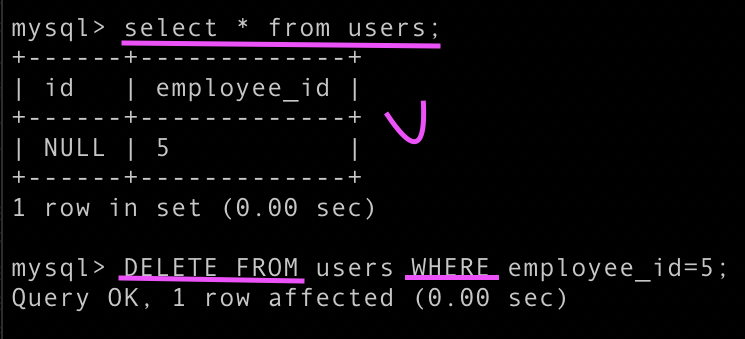 DELETE FROM 'table name' WHERE 후에 select * from users; 하면 없다.