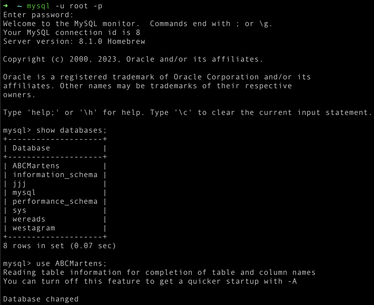 mysql> USE westagram;