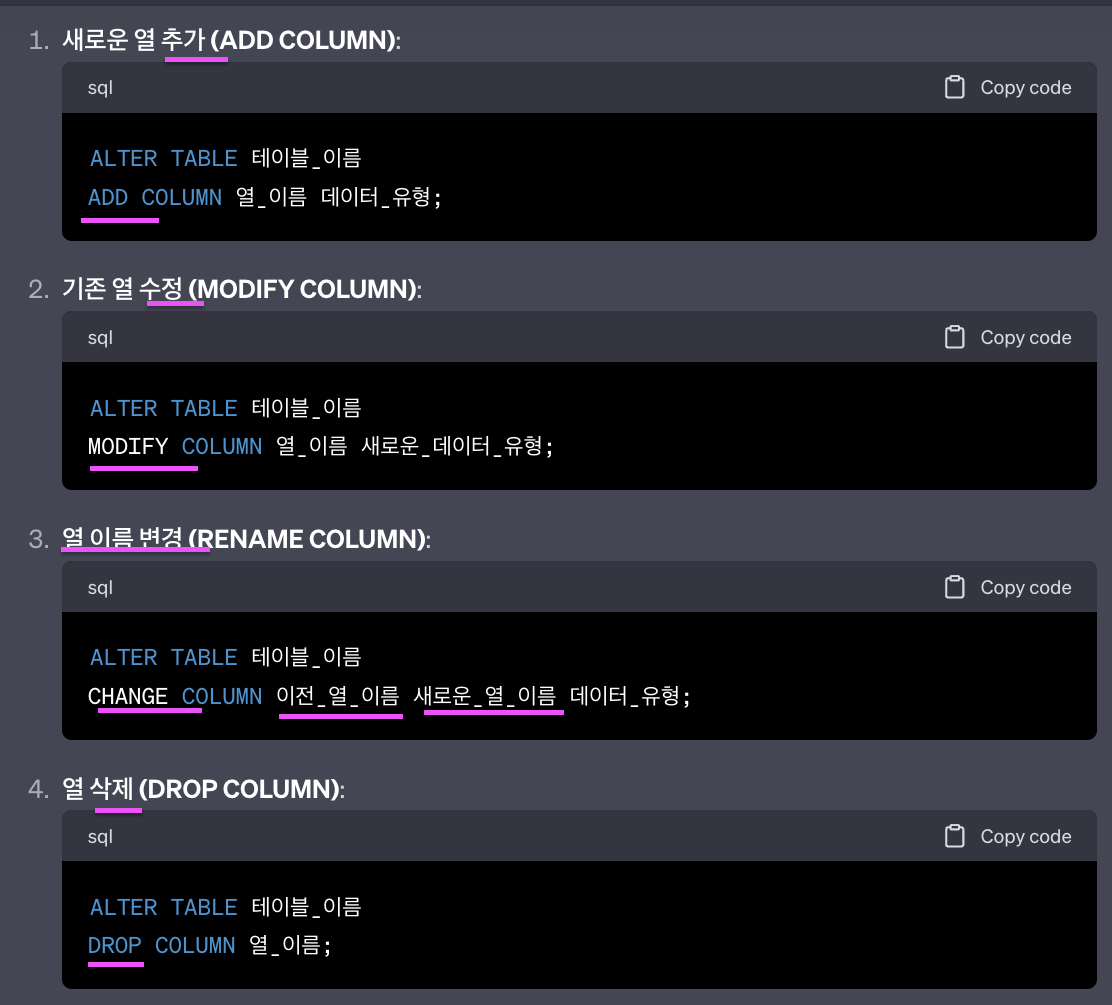 > ALTER TABLE '변경하고자하는 table 이름' 'ADD' 'column 이름' '자료형' '제약 조건' // 열 추가