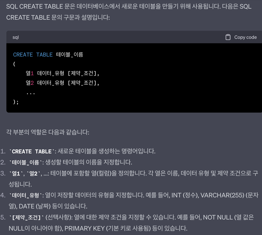- CREATE TABLE 'table 이름' (column1 INT AUTO_INCREMENT PRIMARY KEY, column2 VARCHAR(50),