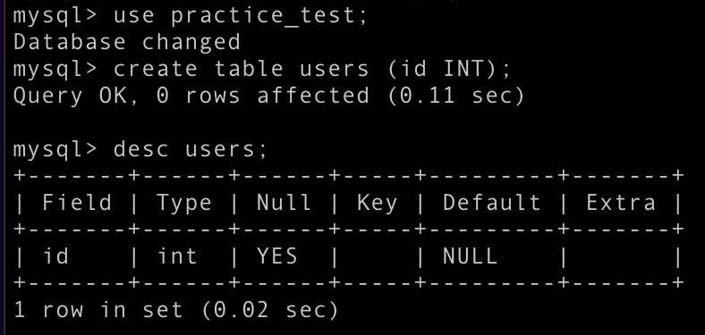 > CREATE TABLE 'table 이름' ( id INT);