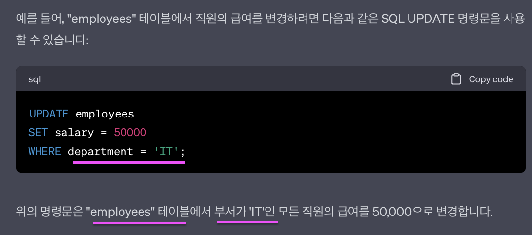 : ~ 테이블의 ~열 중에서 조건이 ~인 data를 수정