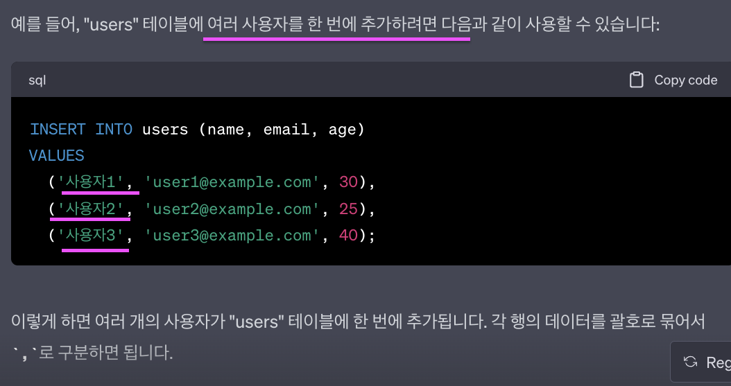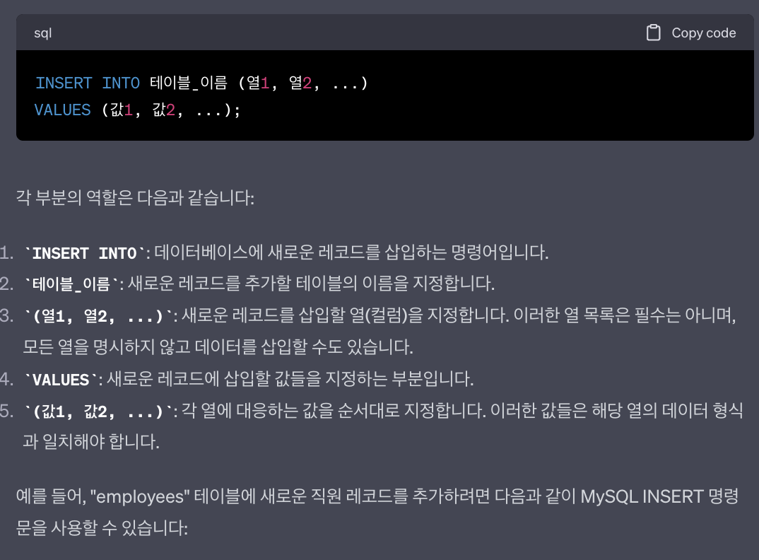 # VALUES 뒤에는 실제로 넣을 값을 소괄호로 감싸주고 앞서 테이블의 칼럼을 지정한 순서대로 데이터를 넣으면 됩니다.