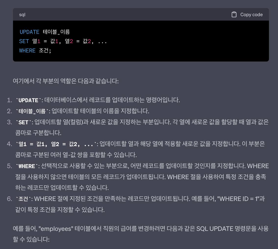 UPDATE table name SET 'column name1: vaule1', 'columun name 2 : value 2', ... WHERE 조건(ex. WHERE email = '${email}' )