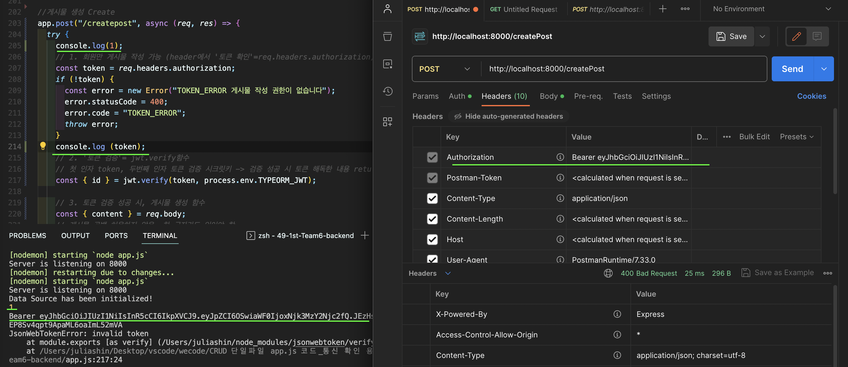 [postman] Api 주소 createPost, createpost 상관없는지 -> url은 소문자가 법칙 [postman header에 token 담기] Auth에 안 해도 되고 bearer 안해도 되고 Tests 안 해도 되고 environment - global 전역변수 안 해도 되고 Headers
