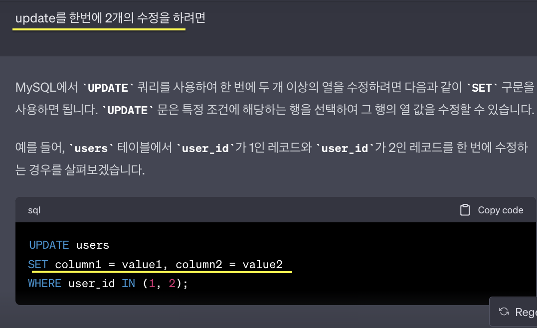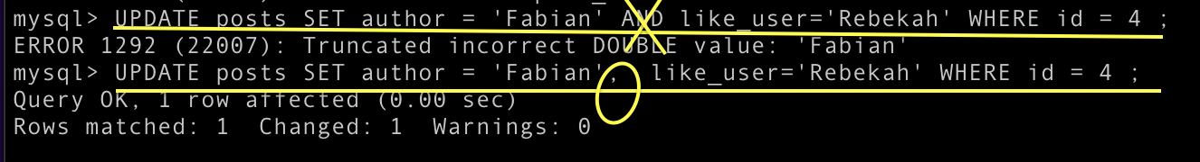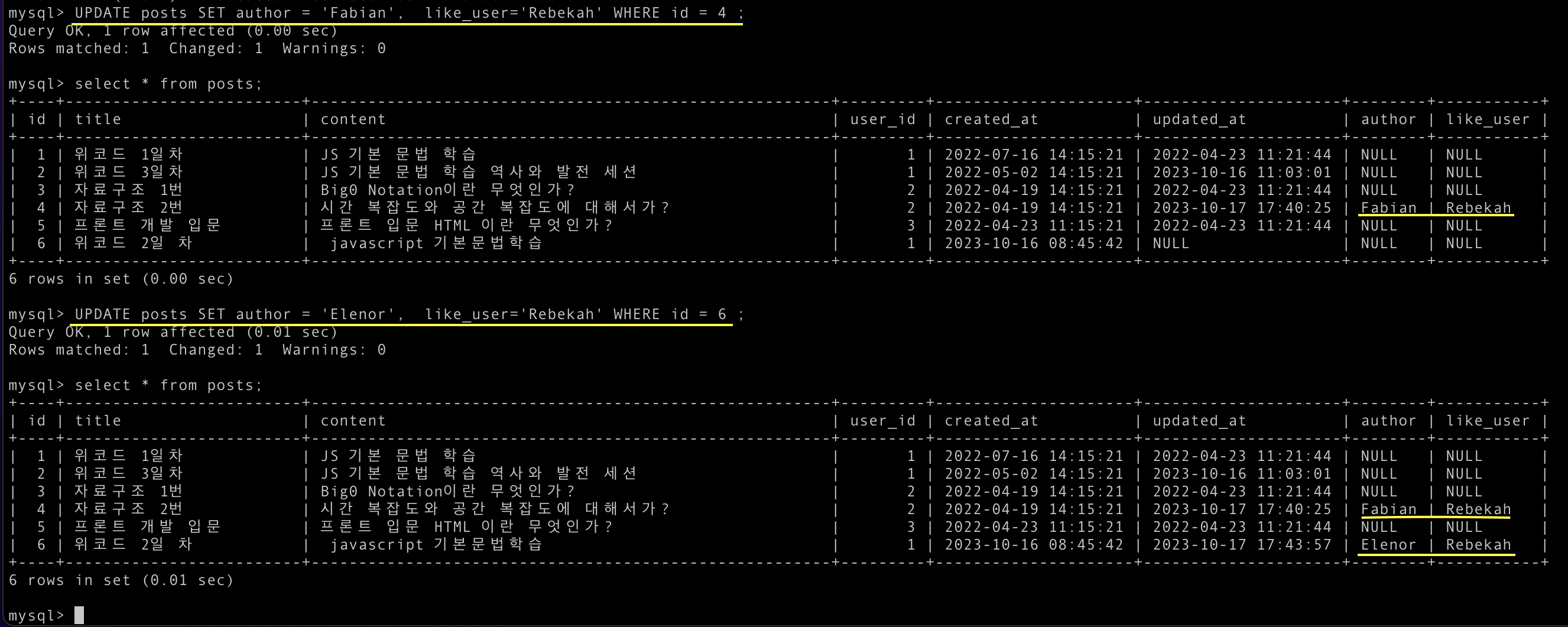update set 쿼리문 -> 쉼표로 한번에 두개 변경