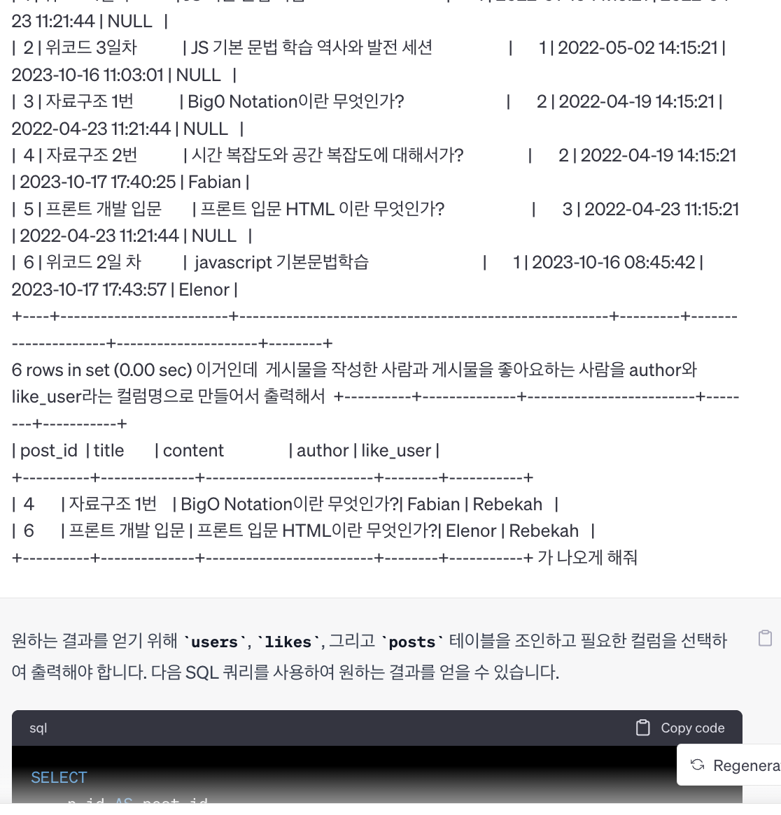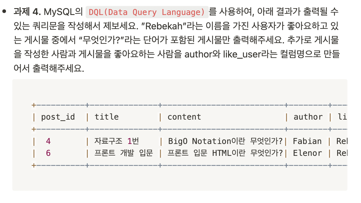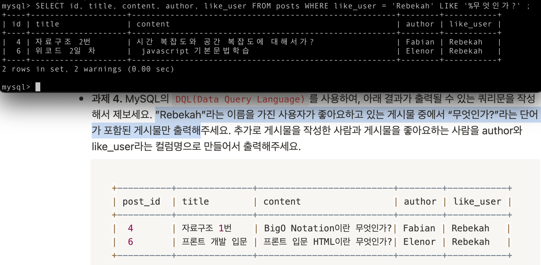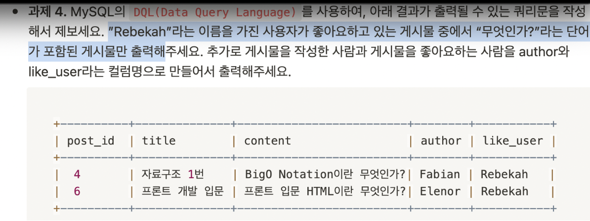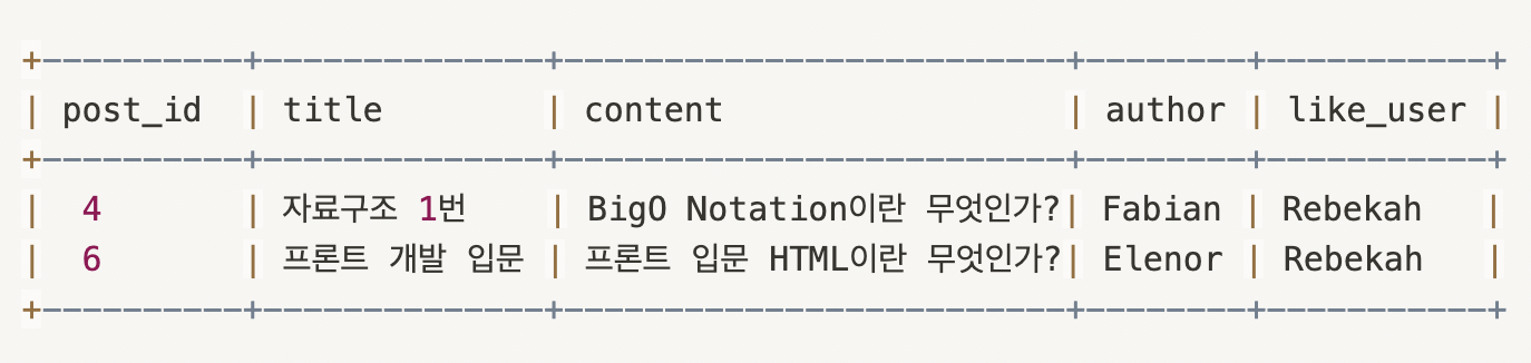 이제 아래 표와 같이만 나오게 해야 한다. ㅡ-> ”Rebekah”라는 이름을 가진 사용자가 좋아요하고 있는 게시물 중에서 “무엇인가?”라는 단어가 포함된 게시물만 출력해