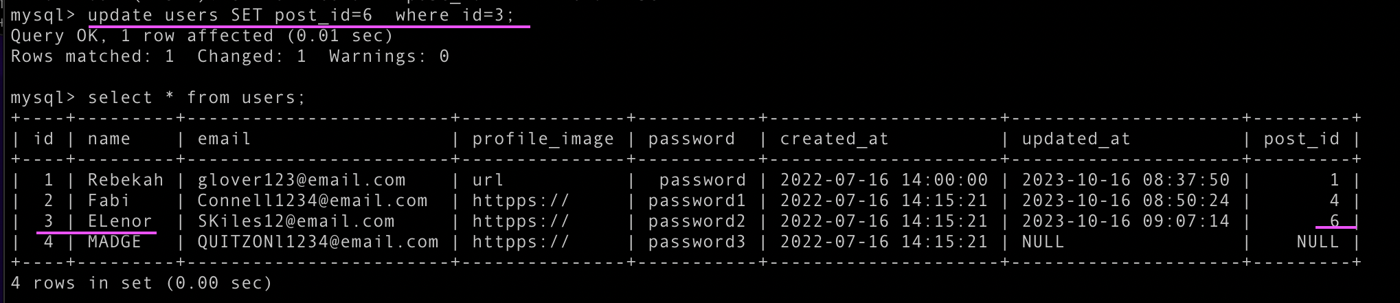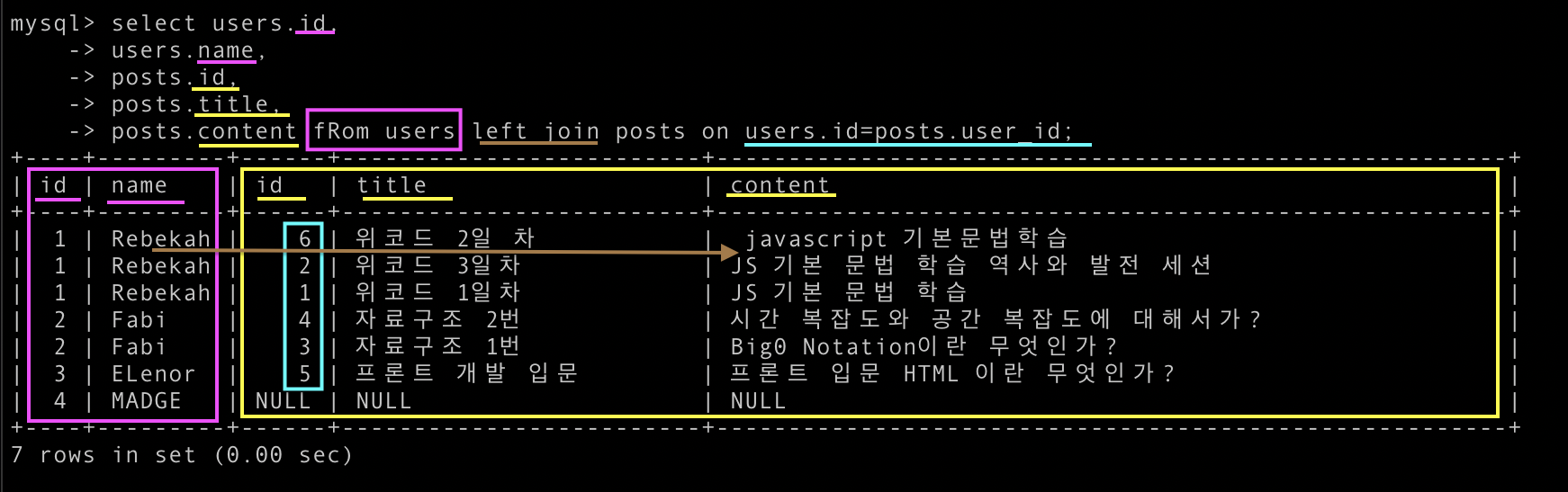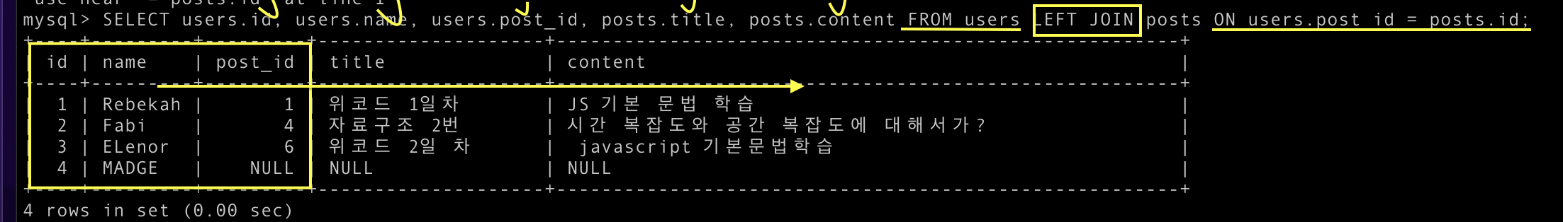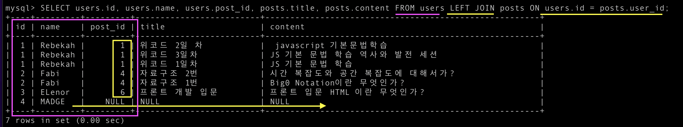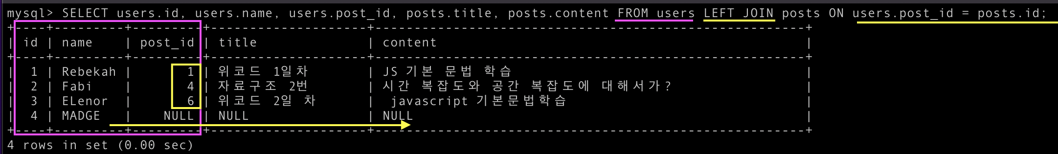 mysql> SELECT users.id, users.name, users.post_id, posts.title, posts.content FROM users LEFT JOIN posts ON users.post_id = posts.id;