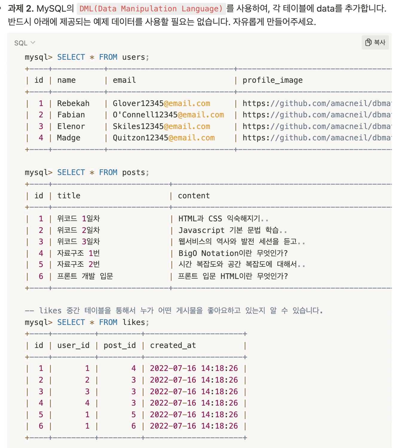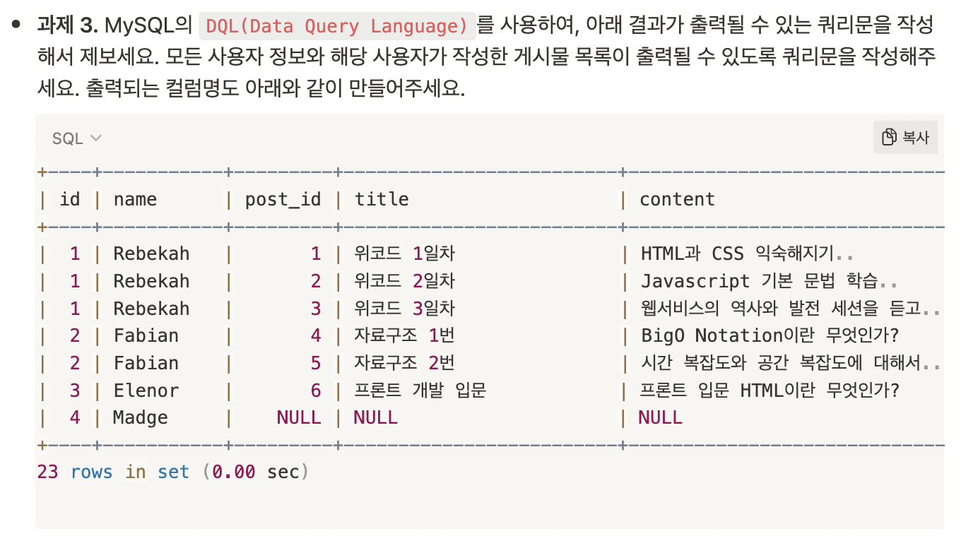 이후 프로젝크 3차 하면서 sql 공부하면서 채우게 된 [SQL복습 ] 과제 https://pm-developer-justdoit.tistory.com/70 Foundation 2 과제 - sns posting 게시물 CRUD [포스팅 생성, 조회, update, 삭제] ** westagram을 만들 건데