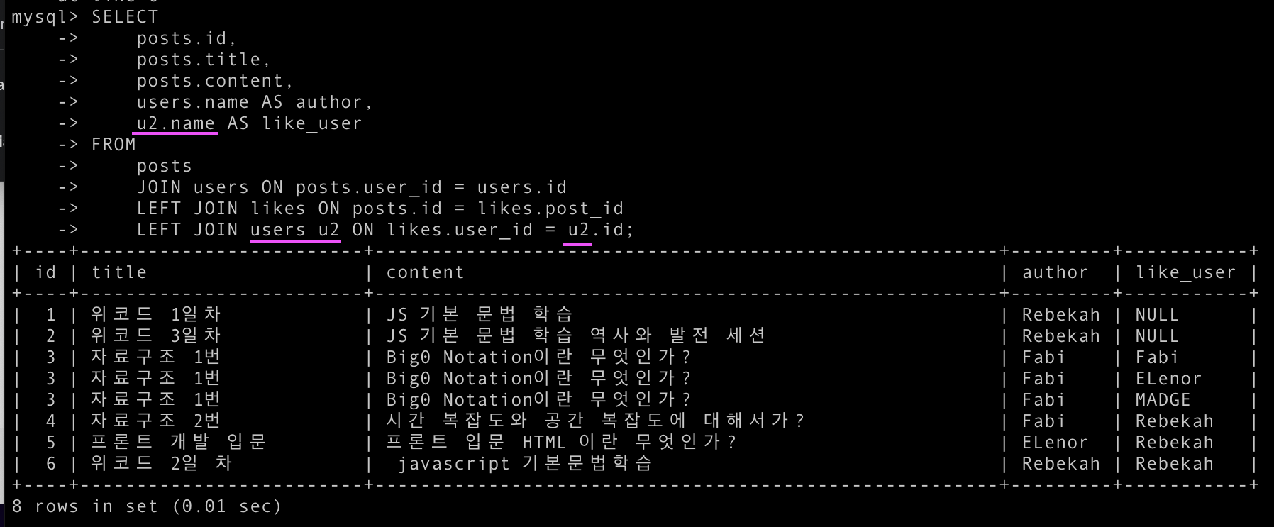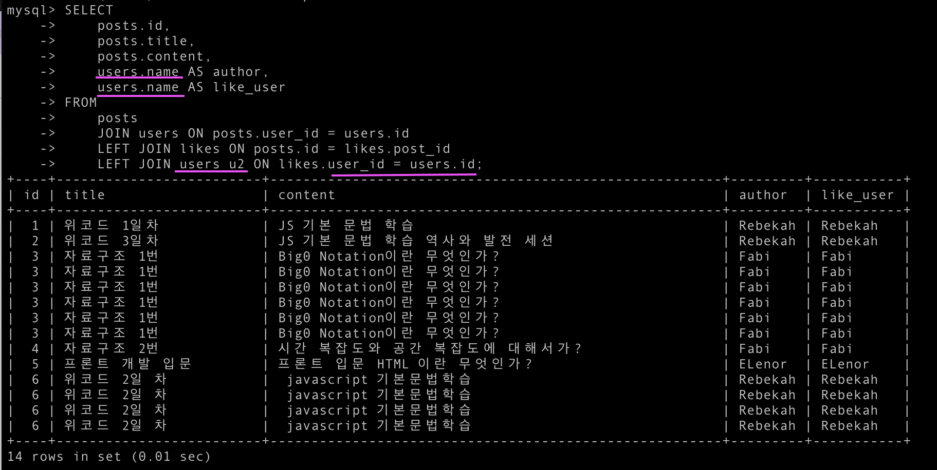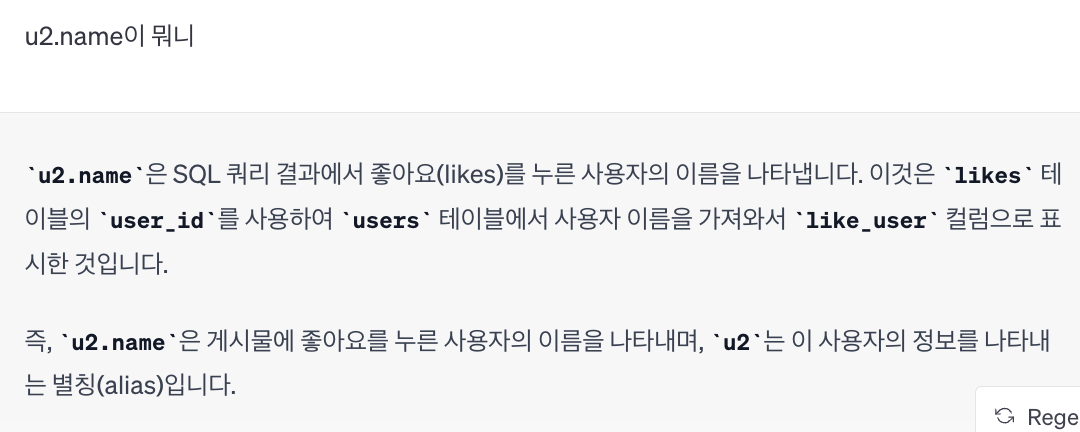 likes의 user_id를 기준으로 join 했는데, 그거를 like_user 칼럼으로 표시해서,