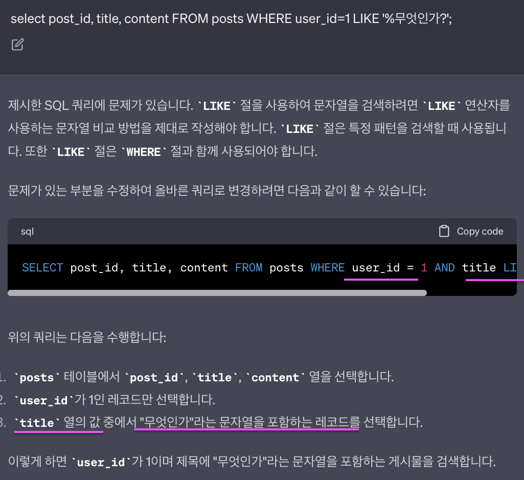 select id, title, content FROM posts WHERE user_id=1 AND content LIKE '%무엇인가?';