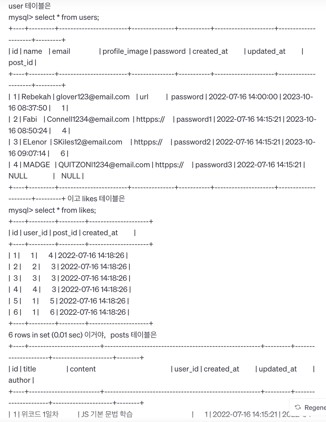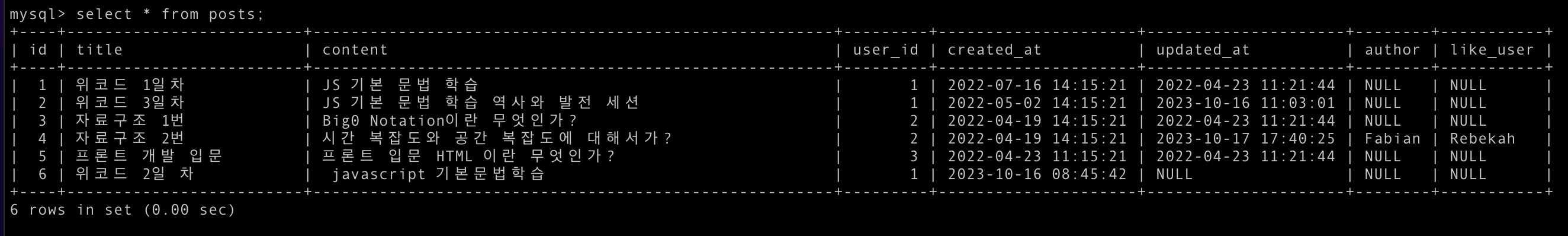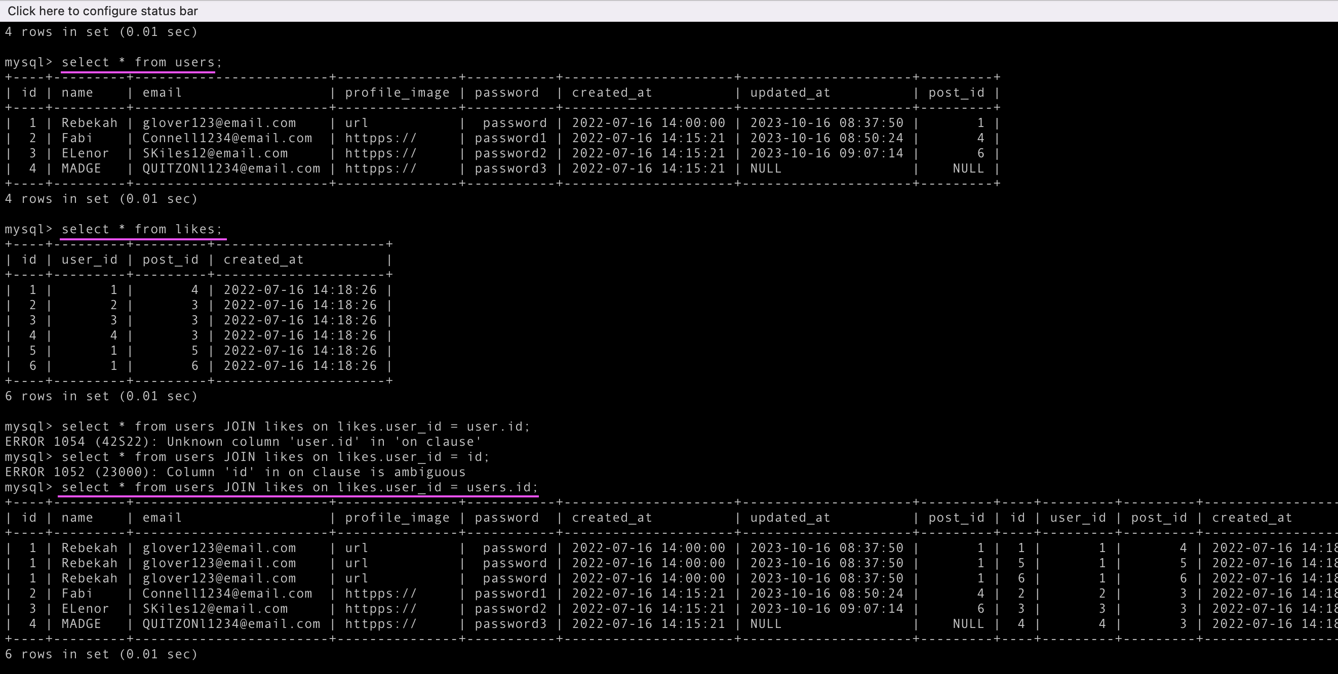 mysql> SELECT users.id, users.name, users.post_id, posts.title, posts.content FROM users LEFT JOIN posts ON users.id = posts.user_id;