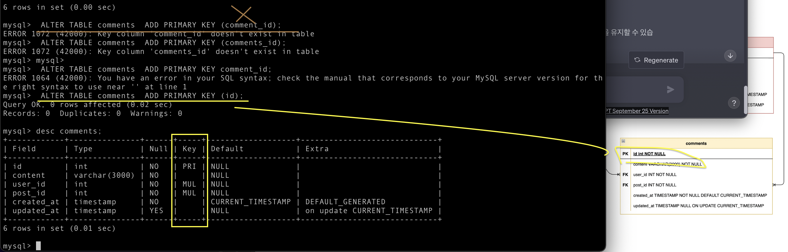 mysql> ALTER TABLE comments ADD PRIMARY KEY (comment_id); 가 아니다