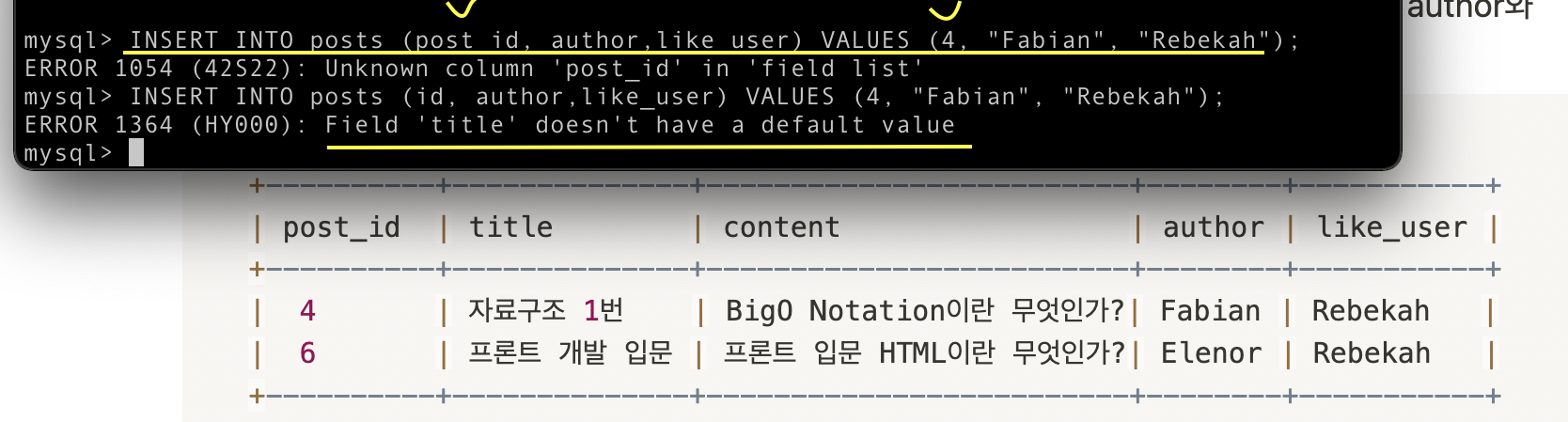 원하는 칼럼만 넣고, 값을 넣는 게 아니라,(--> 이거는 update) 모든 열을 다 언급해주고 거기에 상응하는 값을 넣어줘야 한다.