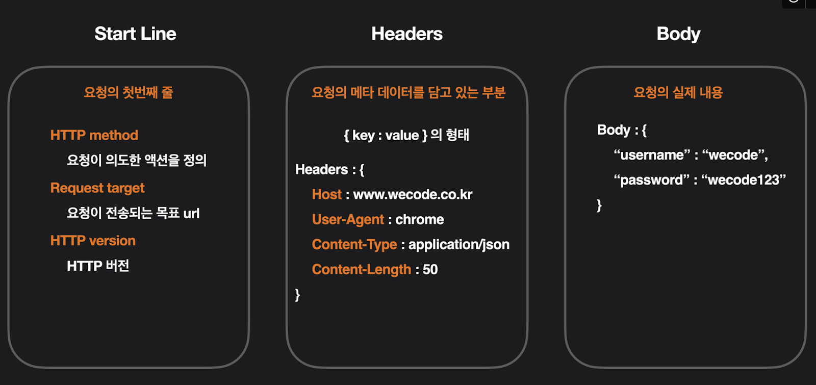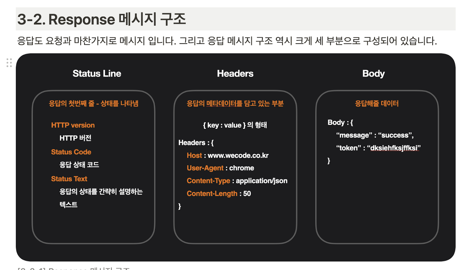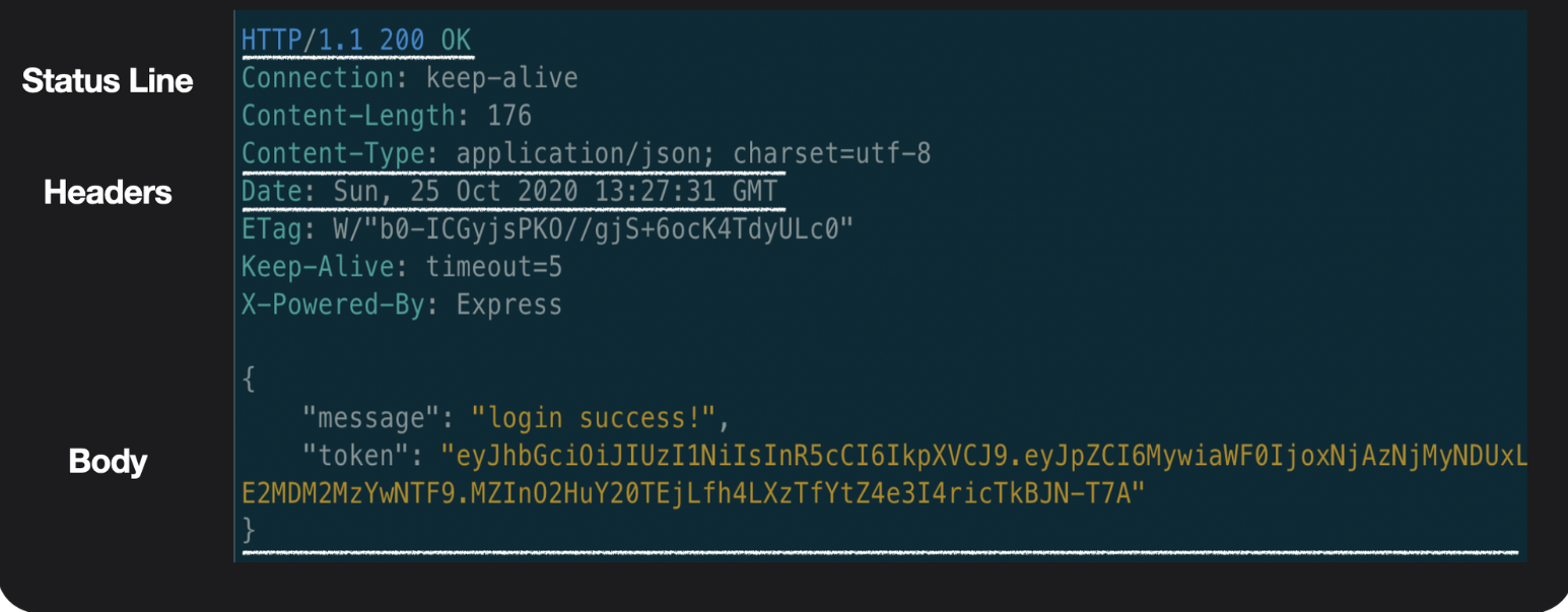 - Status text: 응답상태 간략 설명 텍스트/ 사람도 이해하라고 같은 내용을 텍스트로 알려주는 거 (숫자로 이해하기 어려우니 다시 얘기해주는거)