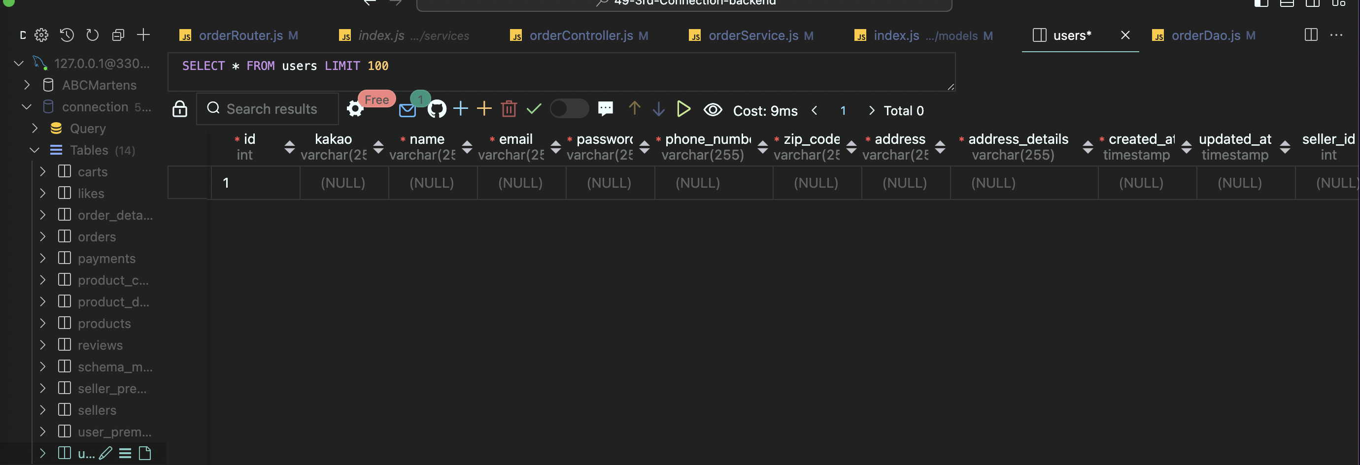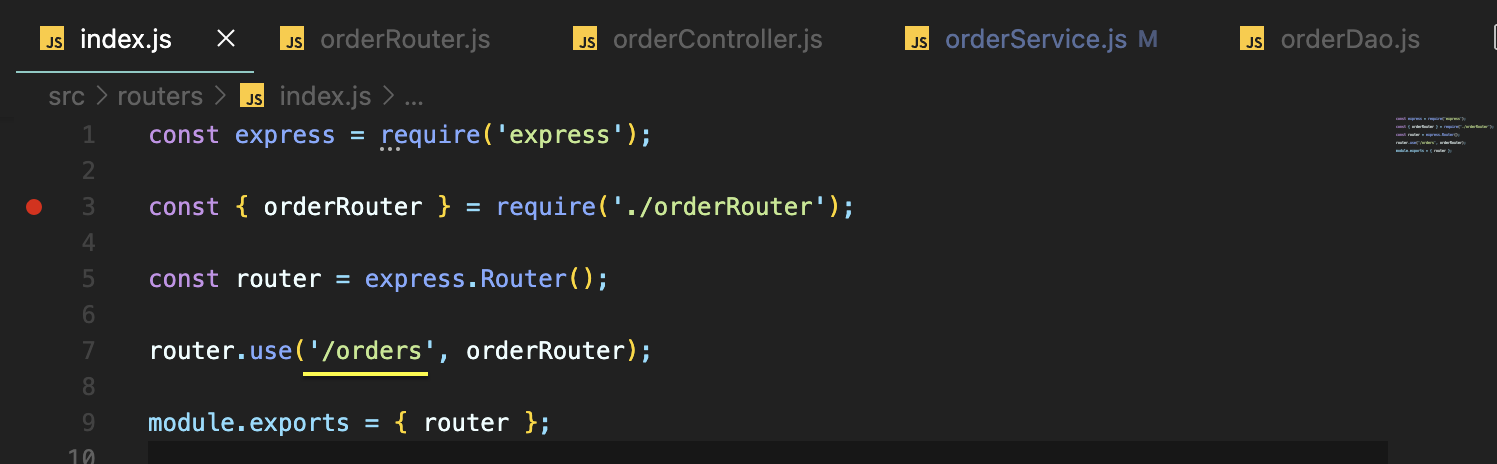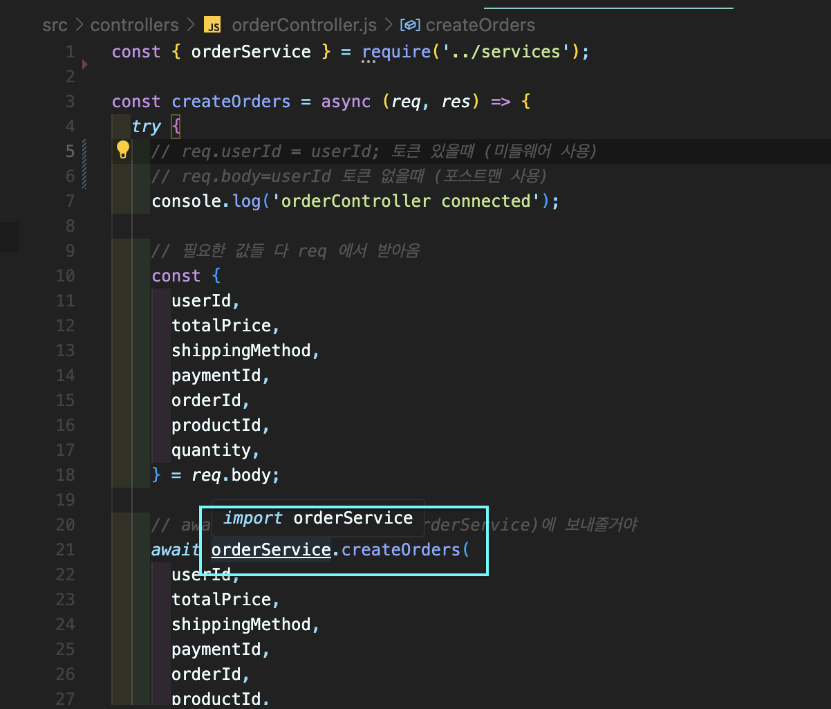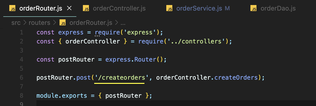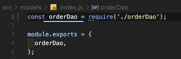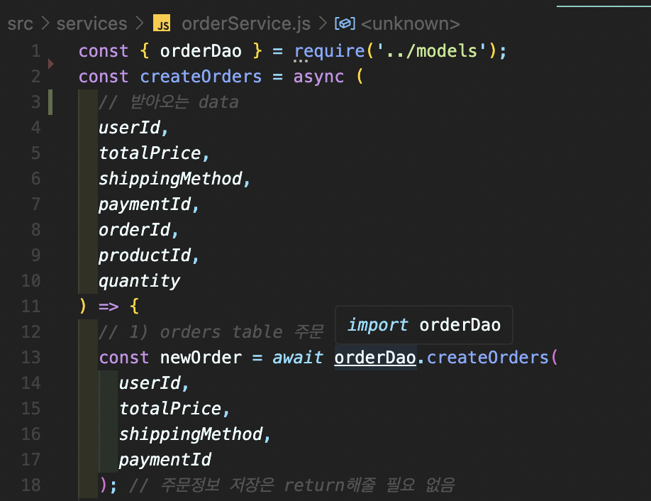 그러면, orderDao를 불러오는, orderServie.js 로 가서, orderDao가 잘 연결 되어 있는지